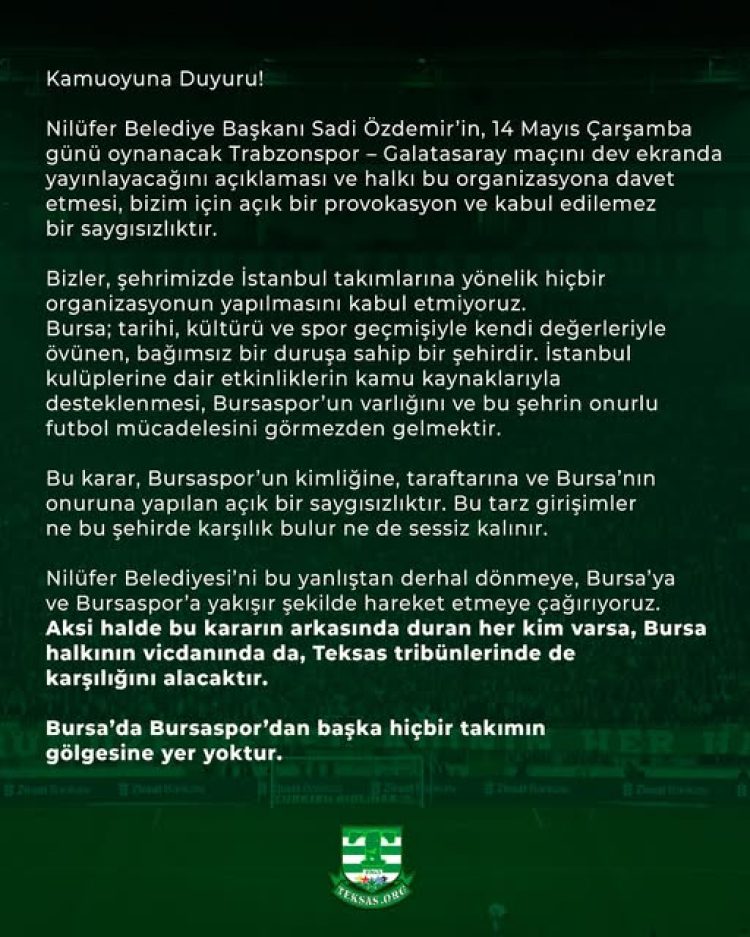 Bursaspor’un köklü taraftar grubu Teksas, Nilüfer Belediye Başkanı Sadi Özdemir’in bugün oynanacak Trabzonspor–Galatasaray maçını dev ekranda yayınlayacağını duyurmasına sert tepki gösterdi.