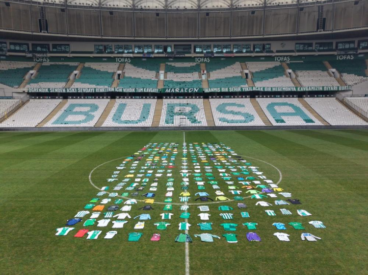Bursa Atatürk Spor Kompleksi Matlı Stadyumu'nda zemine konulan yüzlerce imzalı forma gökyüzünden görüntülendi.