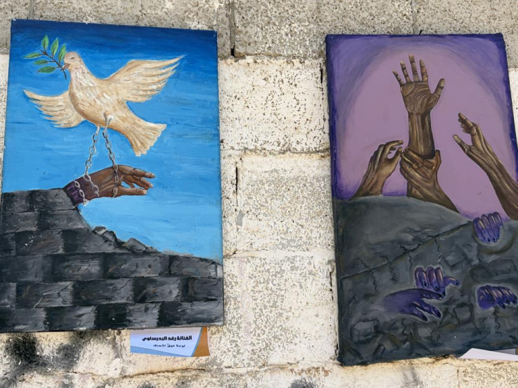 İki eseriyle sergiye katılan sanatçı Raghd al-Badrasawi, bir tablosunun, elleri kaplayan külü tasvir ettiğini ve bunun enkaz altından kurtulmaya ve yıkımdan kaçmaya çalışan insanları simgelediğini söyledi. Mor rengi üzüntü ve ıstırabı ifade etmek için kullandığını belirten al-Badrasawi, ellerin ise savaşın acısından ayağa kalkmaya çalışan bir halkı temsil ettiğini ifade etti. Ateşkesten sonra yaptığı ikinci tablosuyla da zincire vurulmuş bir barış güvercinini ve kurtulmaya çalışan bağlı bir eli tasvir eden Al-Badrasawi, bu çalışmanın ateşkese rağmen ülkenin hala savaşın pençesinde olduğu gerçeğini aktardığını söyledi. Raghd al-Badrasawi, "Savaşın bittiğini söylüyoruz ama gerçekte bitmedi. Öldürmeler devam ediyor ve hâlâ acı ve keder hissediyoruz" ifadelerini kullanarak, sanatın, Filistin halkının yaşadığı acıları dünyaya aktarmanın bir yolu olduğunu söyledi.