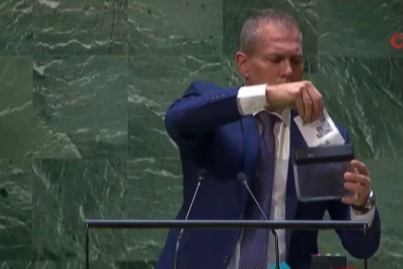 İsrail'in Birleşmiş Milletler (BM) Daimi Temsilcisi Gilad Erdan, BM'nin kuruluş anlaşması metnini kağıt öğütücüye koyarak parçaladı.