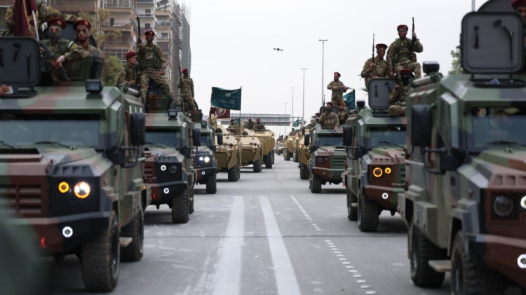 Kutlamalar askeri geçit töreni ile devam etti. Özgürlüğün kutlandığı Şam’da yeni ordunun geniş katılımıyla geçit töreni düzenledi. Tören paraşüt gösterisiyle başladı. Özel kuvvetler, keskin nişancılar, mayın temizleme timleri gibi ordunun birçok biriminin tanklar, askeri birliklerin yeni teçhizatları ile gerçekleştirdiği askeri geçit töreni bir gövde gösterisine dönüştü. Kalabalıklar tarafından coşkuyla izlenen askeri geçit töreni, bölgede sürekli uçuş yapan helikopterler eşliğinde Emevi Meydanı'na, oradan da Gümrük Meydanı'na kadar devam etti. Helikopterler şehitleri anarak çok sayıda broşürü havadan bırakırken geçit töreni, helikopterlerden indirilen birliklerin Şam çevresindeki binalara inişiyle son buldu.