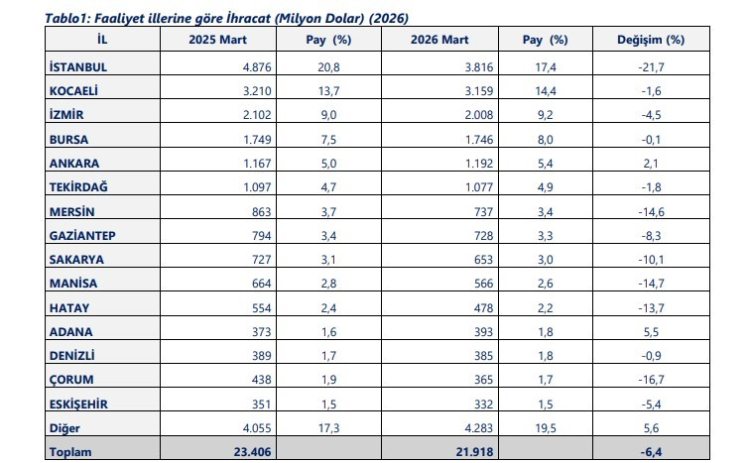 Bakanlık tarafından yapılan açıklamaya göre Mart ayında, İstanbul, Kocaeli, İzmir, Bursa ve Ankara ihracatta ilk beşte yer alan iller olurken, Tekirdağ, Mersin, Gaziantep, Sakarya ve Manisa ikinci beşte yer alan iller oldu. Faaliyet illeri bazında Mart 2026 ihracat sıralamasında 3 milyar 816 milyon dolarla İstanbul ilk sırada yer aldı. Kocaeli 3 milyar 159 milyon dolar ile ikinci, İzmir 2 milyar 8 milyon dolar ile üçüncü, Bursa 1 milyar 746 milyon dolar ile dördüncü, Ankara ise 1 milyar 192 milyon dolar ile beşinci oldu.