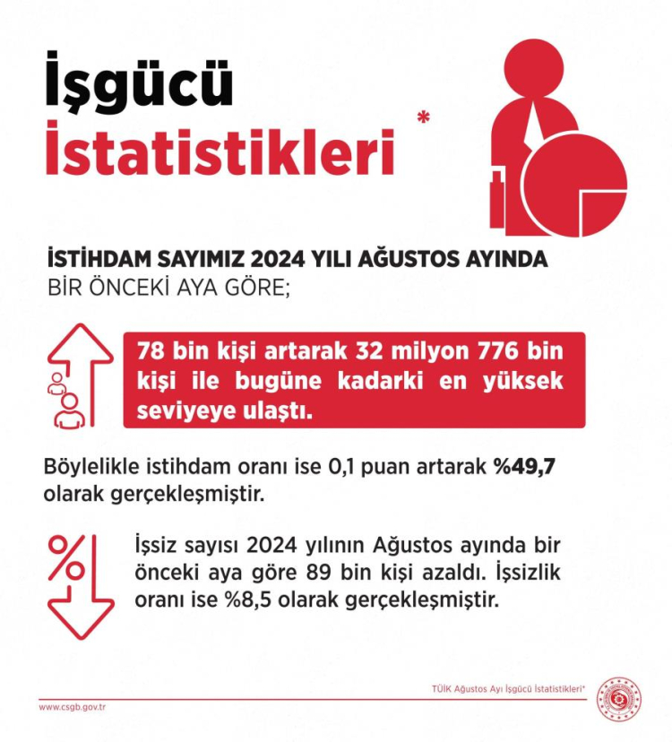 "Orta Vadeli Programla uyumlu şekilde istihdamda olumlu görünüm devam ediyor. İşsizlik oranı son 16 aydır tekli hanelerde seyrediyor. İşsizlik oranı Ağustos ayında bir önceki aya göre 0,3 puan azalarak, yüzde 8,5 seviyesinde gerçekleşti. İşsiz sayısı ise 89 bin kişi azaldı. İstihdam sayımız aynı dönemde 78 bin kişi artarak 32 milyon 776 bin kişi, istihdam oranı ise 0,1 puan artarak yüzde 49,7 oldu. İşsizlikle mücadeledeki kararlılığımızı ve istihdamı destekleyici çalışmalarımızı sürdüreceğiz"
