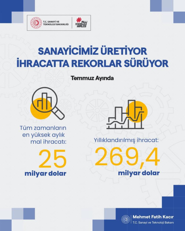 Sanayi ve Teknoloji Bakanı Mehmet Fatih Kacır, sosyal medya hesabından yaptığı açıklamada, Türk sanayisinin katma değerli üretimini kararlılıkla sürdürdüğünü belirterek, temmuz ayı ihracatında tüm zamanların rekorunun kırıldığını duyurdu. Bakan Kacır, "Temmuz ayında mal ihracatımız, geçen yılın aynı ayına göre yüzde 11 artarak 25 milyar dolara ulaştı. Bu rakam, tüm zamanların en yüksek aylık ihracat değeri olarak kayıtlara geçti. Yıllık ihracatımız ise 269,4 milyar dolara yükseldi" ifadelerini kullandı.