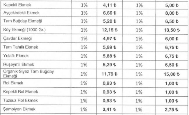 BESAŞ'ta birçok ekmek ürününe zam geldi. Buna göre: Tam buğday ekmeği 6,5 lira, kepekli ekmek 5 lira, köy ekmeği 13,5 lira, siyez ekmek ise 15 lira oldu.