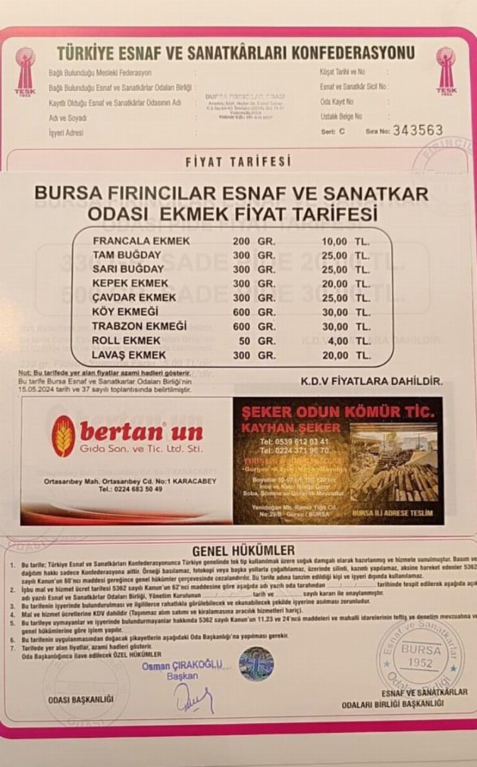 Bursa'da Ocak ayında 250 gram olarak üretilen ekmek 10 liradan tezgahta yerini alırken, artan maliyetlerden dolayı Bursa Esnaf ve Sanatkarlar Odaları Birliği 15 Mayıs tarihinde bir araya geldi. Alınan karar gereği, fiyatta değişiklik yapılmazken, gramajda indirime gidildi. 15 Mayıs tarihine kadar 250 gram francala ekmek 10 liradan tezgahta yerini alırken, bu tarihten itibaren aynı fiyata ancak 200 gram olarak satışa sunulacak. Aynı şekilde fiyatları 20 ve 25 lira olan tam buğday, sarı buğday, kepekli ve çavdar ekmeği ise 400 gramdan 300 grama indirildi. 30 liradan satılan köy ve Trabzon ekmeği ise 700 gramdan 600 grama geriledi. Tek zam gelen ise roll ekmek oldu. 50 gramı 3,5 liradan satılan roll ekmek, 4 lira oldu.