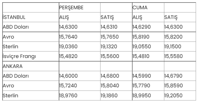 İstanbul ve Ankara serbest piyasalarında alınıp satılan döviz türlerinin, önceki ve bugün itibarıyla alış, satış fiyatları şöyle: