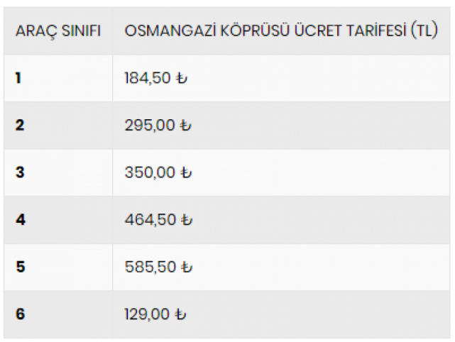 OSMANGAZİ KÖPRÜSÜ TARİFESİ