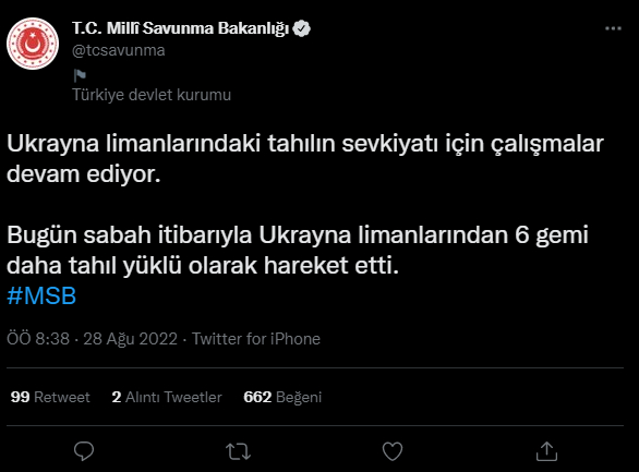 Bakanlığın sosyal medya hesabından yapılan açıklamada "Ukrayna limanlarındaki tahılın sevkiyatı için çalışmalar devam ediyor. Bugün sabah itibarıyla Ukrayna limanlarından 6 gemi daha tahıl yüklü olarak hareket etti." denildi.
