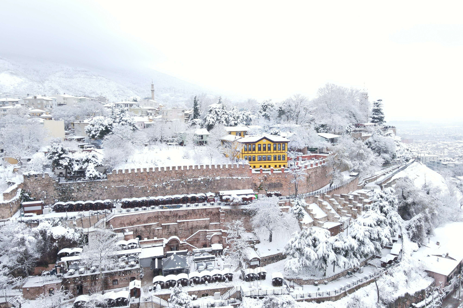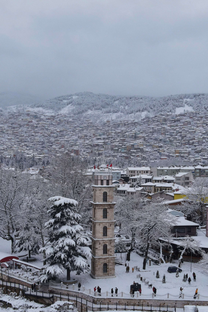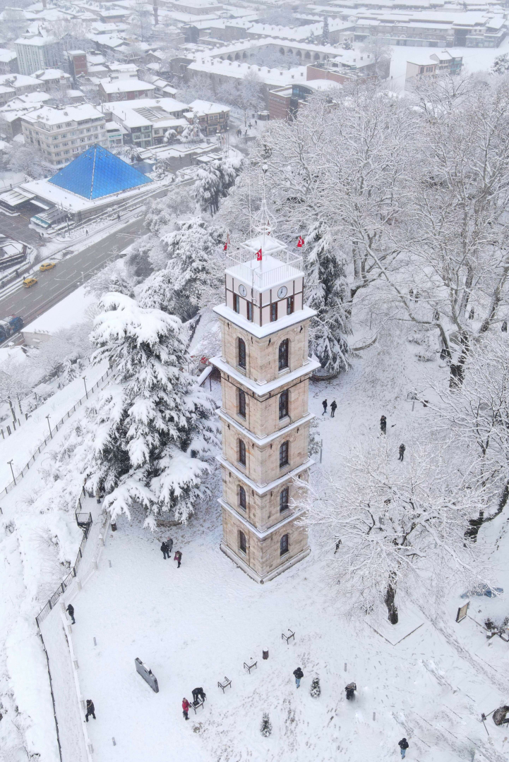 Bursa'da karlar altındaki saat kulesi havadan görüntülendi