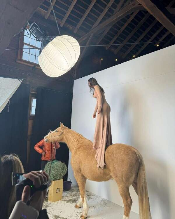 Vogue dergisinin İtalyan edisyonuna poz veren model, bazı karelerde atın üzerinde görülüyor.