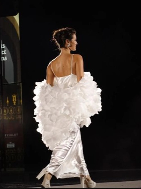 Bir güzellik markasının yüzü olan Deniz, saten beyaz elbisesiyle podyumda boy gösterdi.