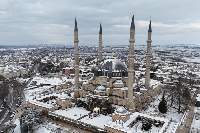 Beyaza bürünen Mimar Sinan'ın ustalık eseri tarihi Selimiye Camii vatandaşlara adeta görsel şölen yaşattı.