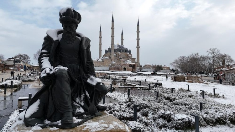 Edirne'de kar yağışıyla birlikte tarihi Selimiye Camii kartpostallık manzara sundu.