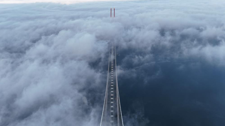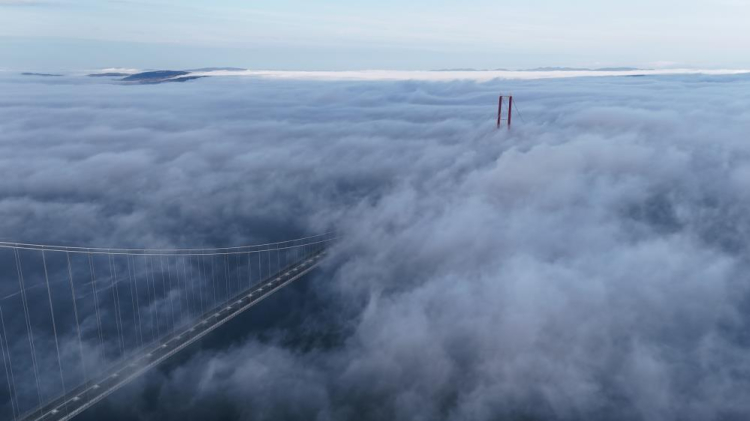 1915 Çanakkale Köprüsü'nün sisler içindeki görüntüsü dron ile görüntülendi. Sis bulutu içindeki 1915 Çanakkale Köprüsü hayran bıraktı.