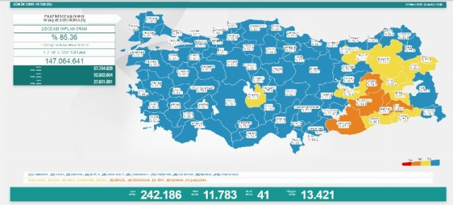 Sağlık Bakanlığı, Günlük Koronavirüs Tablosu'nu "covid19.saglik.gov.tr" adresinden paylaştı. Tabloya göre, son 24 saatte 242 bin 186 Kovid-19 testi yapıldı, 11 bin 783 kişinin testi pozitif çıktı, 41 kişi ise hayatını kaybetti.