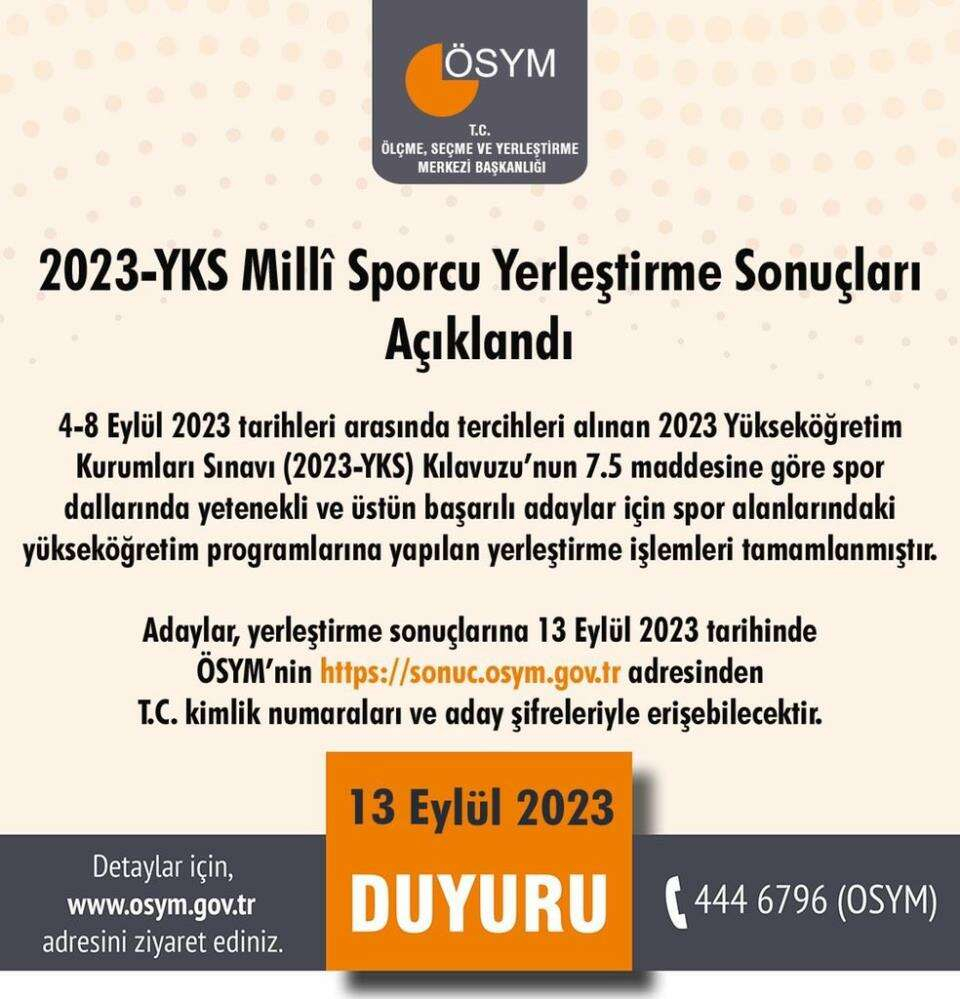 Ölçme, Seçme ve Yerleştirme Merkezi (ÖSYM) Başkanlığı tarafından 2023-YKS Milli Sporcu yerleştirme sonuçları açıklandı.