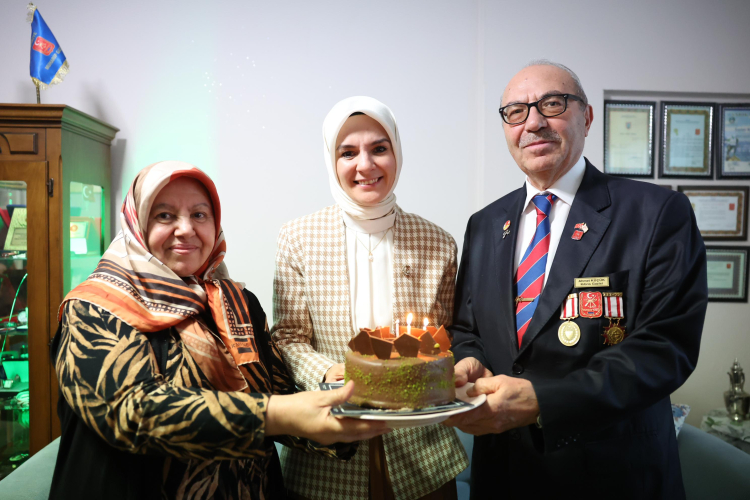 Aile Yılı dolayısıyla gerçekleştirdiği ziyarette Göktaş, çiftin 50. evlilik yıl dönümleri dolayısıyla aileye pasta sürprizi yaptı.