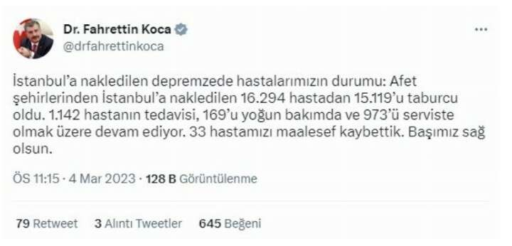 Sağlık Bakanı Fahrettin Koca, “Afet şehirlerinden İstanbul’a nakledilen 16 bin 294 hastadan 15 bin 119’u taburcu oldu. 33 hastamızı maalesef kaybettik. Başımız sağ olsun” dedi.