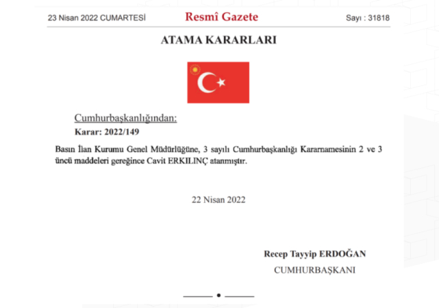 Cumhurbaşkanı Recep Tayyip Erdoğan’ın imzasıyla, 23 Nisan 2022 tarihli Resmi Gazete’de yayımlanan 2022/149 sayılı atama kararıyla Basın İlan Kurumu Genel Müdürü olarak Cavit Erkılınç atandı.
