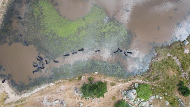 Ankara'nın Kızılcahamam ilçesindeki yaylalarda yetiştirilen mandalar göletlerde serinlemesi dron ile görüntülendi.