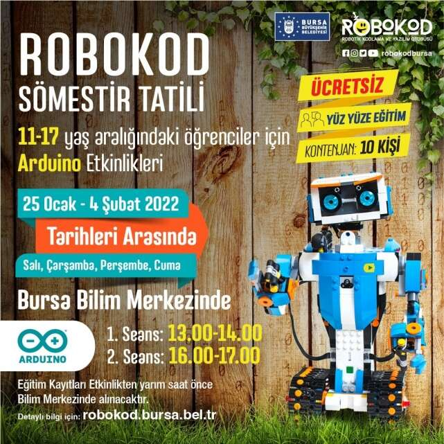 Daha önce robokod kodlama ve yazılım otobüslerinde yüz yüze verilen ancak pandemi nedeniyle online yapılmaya devam eden kodlama ve yazılım eğitimi, yarı yıl tatiline özel olarak Bursa Bilim ve Teknoloji Merkezi’nde (BTM) yüz yüze yapılacak.