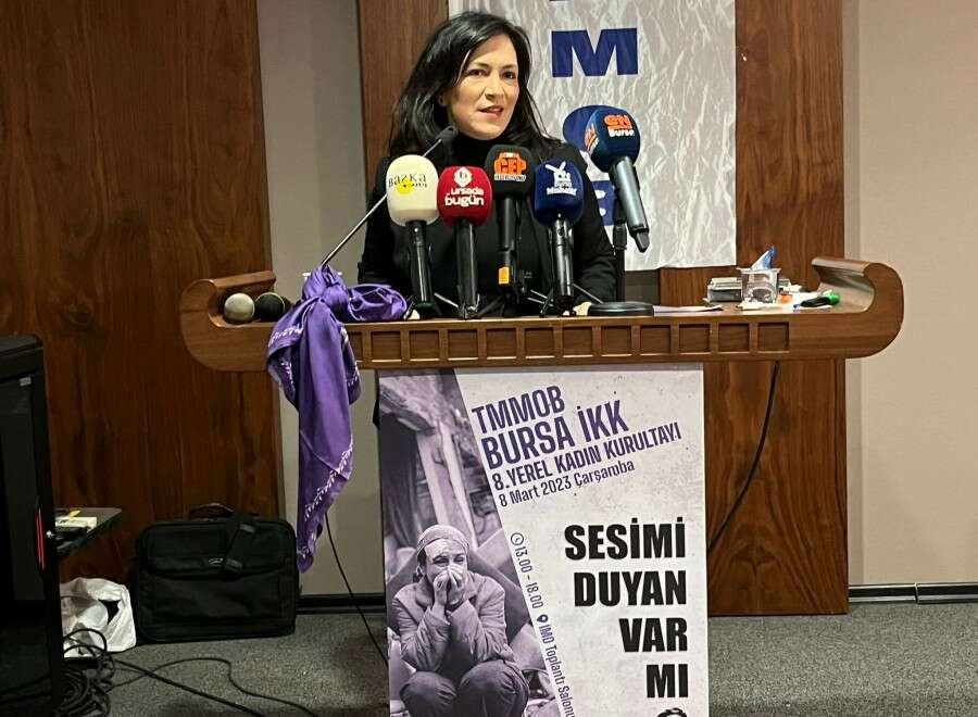Bursa İnşaa Mühendisleri Odası Bursa Şubesi Yönetim Kurulu Başkanı Ülkü Mercan Küçükkayalar, "Kadınlar erkeklere göre daha çok etkilenmektedirler. Bu etkiler üzerinden konuya dikkat çekmek ve farkındalık oluşturmak üzere kurultayımızda konuşmacılarımız kendi deneyimlerini aktarıp katkı sunacaklar. Kurultayımız afette kadın deneyimi, afet kadın dayanışması ve afette kadın gönüllülüğü şeklinde iki başlıkta gerçekleşecek olup hüznümüzün sesi türkülerimiz dinletisiyle tamamlanacaktır. Sayın konuklar, değerli katılımcılar biz tüm kadınlar, her koşulda kadının özgürleşmesi için, kadının insan hakları için söz, yetki ve karar hakkı için, güvenliği için, yaşama hakkı için bir kadın mücadelesiyle yolumuza devam edeceğiz. Bu amaçla yaralarımızı dayanışmayla saracağız. Kadınlar örgütlü TMO daha güçlü diyerek inançla yolumuza devam edeceğiz. Güç ve kararlılıkta olduğumuzun bilinmesini istiyoruz. Kurultayımızın sonuçlarının geleceğe ışık tutacağını bilimin yoluyla hep birlikte umutlarınızı tazeleyeceğimize örgütlülüğümüzü güçlendireceğimize ve dayanışmamızı büyüteceğimize olan inancımızla yaşadığımız afetlerde kaybettiğimiz bütün meslektaşlarımızı tüm insanlarımızı tüm canlılar için üzüntümüzü bir kez daha dile getiriyor, Allah'tan rahmet diliyor ve yaralılarımıza geçmiş olsun dileklerimizi iletiyoruz. Hepinizi tekrar saygıyla, sevgiyle ve dostlukla selamlıyorum. Yaşasın TMMOB! Yaşasın kadın dayanışması!" diye konuştu.