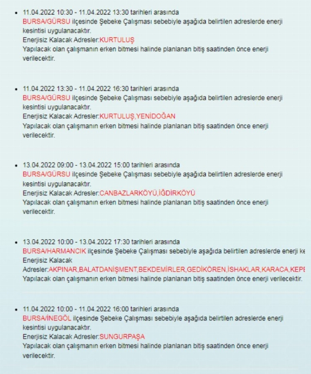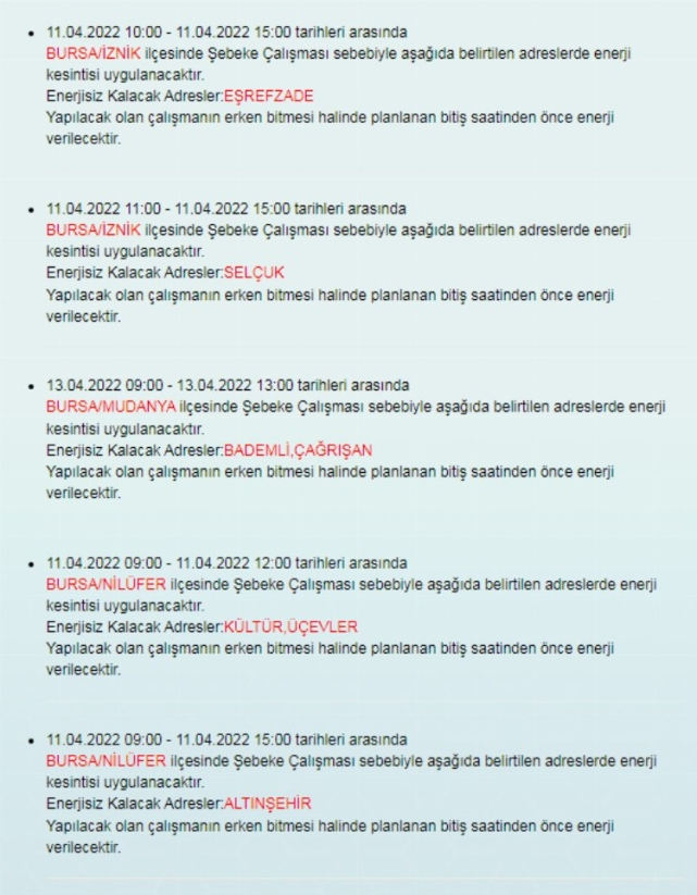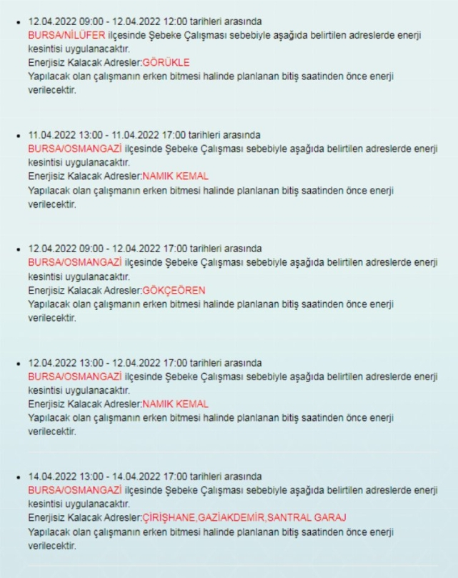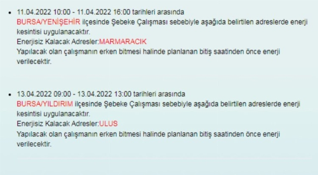 Bursa'nın 9 ilçesinde 3 gün boyunca elektrik kesintileri yapılacak.