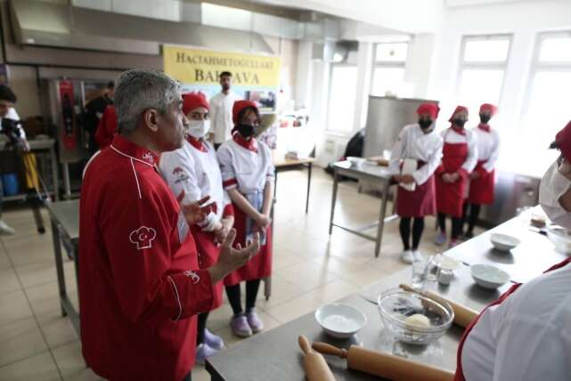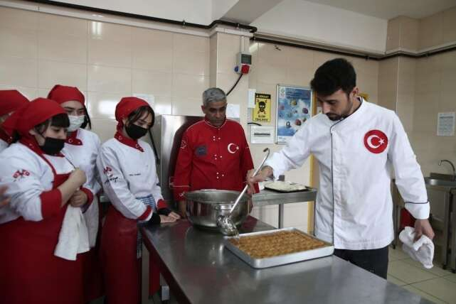 Bir baklava firması ile tamamı kız öğrencilerin eğitim gördüğü okul arasında yapılan protokol çerçevesinde kadın baklava ustalarının sayısının arttırılması hedefleniyor. 10’uncu sınıf öğrencileri, uygulamalı eğitim aldıkları sınıfta baklava ustaları İmdat Tekin ve Arif Aslan tarafından baklavanın püf noktalarını öğrendiler.