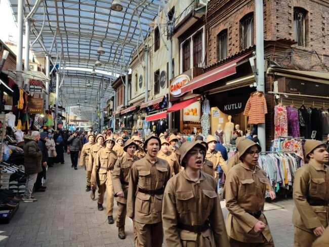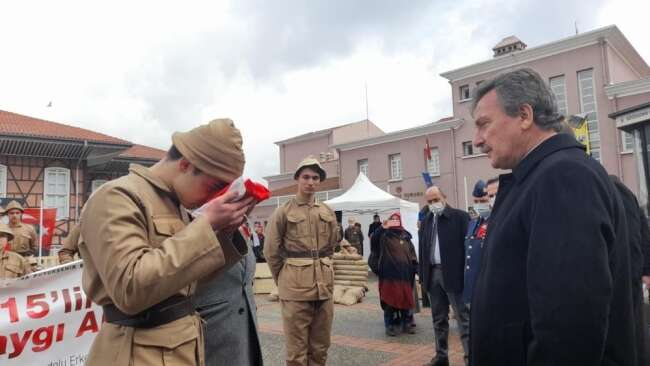 BursaBüyükşehir BelediyesiKültür Akademisi ile ‘savaş döneminde öğrencilerini Çanakkale’ye gönderdiği için mezun veremeyen okullardan birisi olan’ Bursa Erkek Lisesi işbirliğinde düzenlenen saygı alayı, Tarihi Çarşı ve Hanlar Bölgesi’nde kortej yürüyüşü yaptı. Kapalı çarşıdan geçerek tarihi belediye binası önüne gelen öğrenciler, burada ellerindeki Türk Bayrağı ve Kuran-ı Kerim’i öperek, BursaValisi Yakup Canbolat ile Büyükşehir Belediyesi Başkanvekili Süleyman Çelik’e teslim etti.