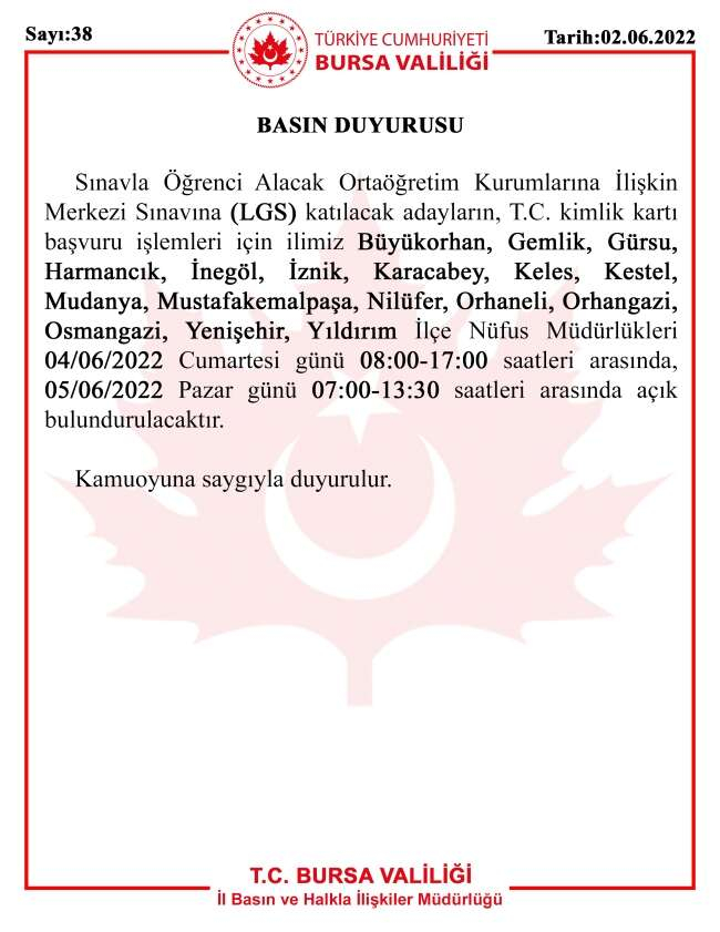 Bursa Valiliği, Liselere Geçiş Sınavı'na (LGS) girecek öğrencilerin T.C. Kimlik Kartı başvuru işlemleri için, tüm ilçelerdeki Nüfus Müdürlüklerinin hafta sonu da açık olacağını duyurdu.