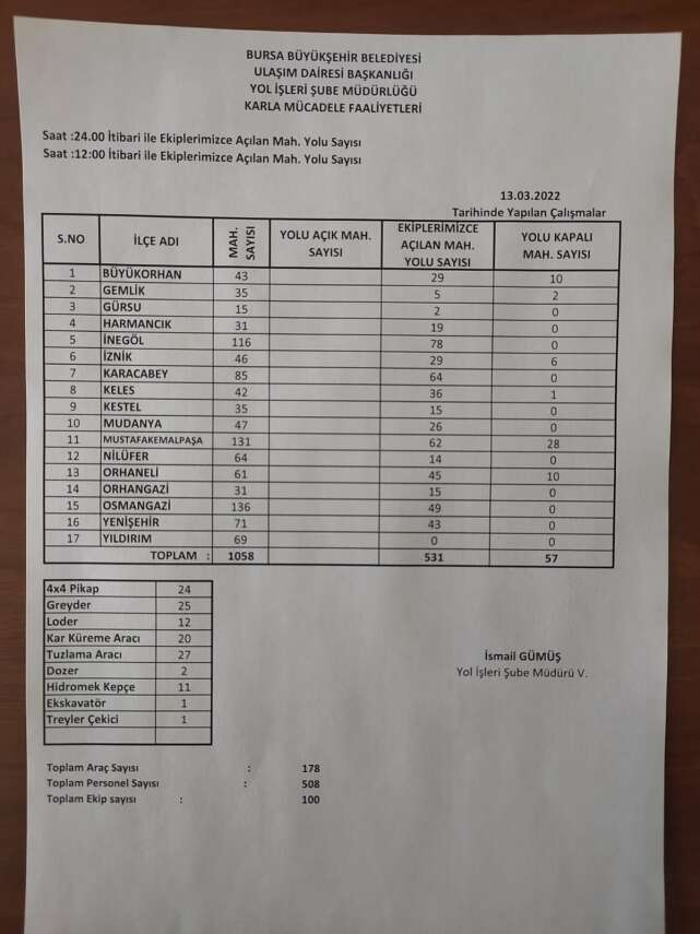 Çalışmalar kapsamında Büyükorhan’da 29, İnegöl’de 78, Orhaneli’nde 45, İznik’te 29, Keles’te 36, Kestel’de 15, Mustafakemalpaşa’da 62, Gürsu’da 2, Osmangazi’de 49, Gemlik’te 5, Nilüfer’de 14, Orhangazi’de 15, Karacabey’de 64, Harmancık’ta 19, Mudanya’da 26 ve Yenişehir’de 43 mahallenin yolu ulaşıma açıldı.