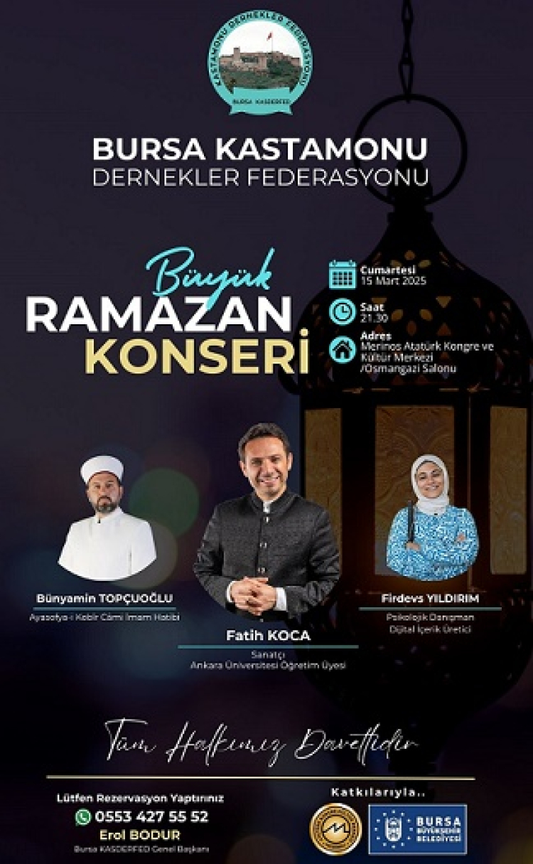 Ramazan ayı etkinlikleri kapsamında Bursa Kastamonulular Federasyonu Merinos Atatürk Kongre Kültür Merkezi'nde 15 Mart Cumartesi akşamı Büyük Ramazan Konseri'nde biribirinden değerli isimleri Bursalılar ile buluşturacak.
