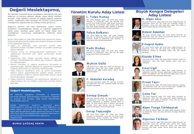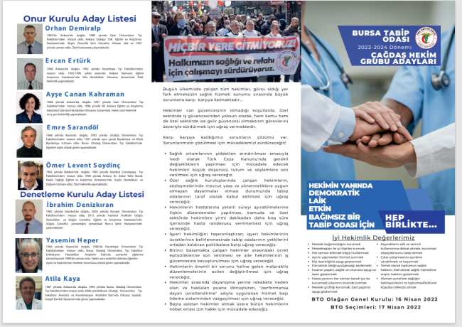 Türk Tabipleri Birliği’ne bağlı ve Anayasal güvence altında, 6023 Sayılı Yasa ile kurulmuş kamu kurumu niteliğinde olan Bursa Tabip Odası’nın 3 bin üzerinde üyesi bulunuyor. 16 Nisan’da Genel Kurul’un, 17 Nisan’da ise Seçimin gerçekleştirileceği genel kurulda, Odanın 38’nci yönetimi seçilecek. 16 Nisan’daki Genel Kurul, Bursa Akademik Odalar Birliği Oditoryumu’nda, 17 Nisan’daki seçim ise BAOB 1. Kat Fuaye alanında gerçekleştirilecek.