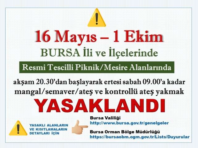 Bursa ve ilçelerinde aşağıda isimleri ve mevkileri yazılı piknik ve mesire alanlarında 16 Mayıs-01 Ekim 2022 tarihine kadar her akşam saat 20.30'dan başlayarak ertesi sabah saat 09.00'a kadar mangal, semaver, ateş ve kontrollü ateş yakmak yasaklandı"