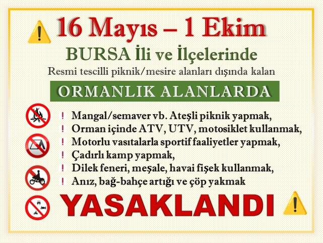 Alınan karar çerçevesinde, Bursa ve ilçelerinde 16 Mayıs-1 Ekim tarihlerinde resmi tescilli piknik/mesire alanları dışında kalan ormanlık alanlarda mangal, semaver gibi ateşli piknik yapmak, orman içinde ATV, UTV, motosiklet kullanmak, motorlu vasıtalarla sportif faaliyetler yapmak, çadırlı kamp yapmak, dilek feneri, meşale, havai fişek kullanmak, anız, bağ-bahçe artığı ve çöp yakmanın yanı sıra akşam saat 20.30'dan ertesi sabah 09.00'a kadar yasaklandı.