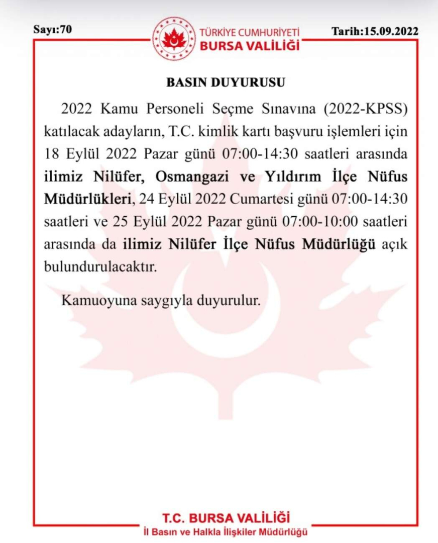 2022 Kamu Personeli Seçme Sınavina (2022-KPSS) katılacak adayların, T.C. kimlik kartı başvuru işlemleri için 18 Eylül 2022 Pazar günü 07:00-14:30 saatleri arasında ilimiz Nilüfer, Osmangazi ve Yıldırım İlçe Nüfus Müdürlükleri, 24 Eylül 2022 Cumartesi günü 07:00-14:30 saatleri ve 25 Eylül 2022 Pazar günü 07:00-10:00 saatleri arasında da ilimiz Nilüfer İlçe Nüfus Müdürlüğü açık bulundurulacaktır.