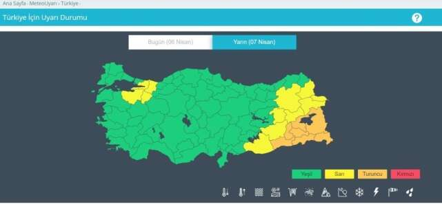 Meteoroloji Genel Müdürlüğü’nden yapılan uyarıda yarın (Perşembe) 15.00’dan Cuma 03.00’a kadar sürmesi beklenen gök gürültülü sağanak yağış hakkında yapılan uyarıda “Marmara’nın güneydoğusunda( Bursa, Yalova, Bilecik, Sakarya illeri ve Kocaeli’nin güneyi) beklenen sağanak ve gök gürültülü sağanak yağışların yerel olarak kuvvetli (21-50 kg/m2) olması beklendiğinden meydana gelebilecek ani sel, su baskını, yıldırım, dolu yağışı, yağış anında kuvvetli rüzgar ve ulaşımda aksamalar gibi olumsuzluklara karşı dikkatli ve tedbirli olunmalıdır” ifadelerine yer verildi.