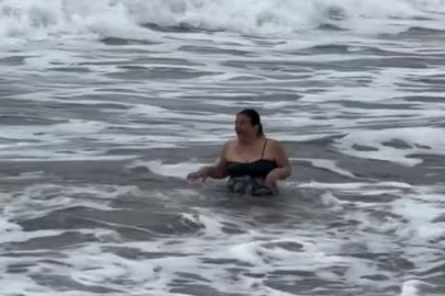 Kastamonu'nun Cide ilçesinde soğuk hava ve kar yağışına aldırış etmeyen bir kadın denize girerek dalgaların arasında yüzdü.