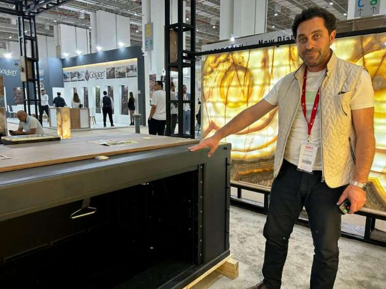 Fuara katma değerli yaptıkları ürünleri tanıtmak için geldiklerini ve katma değerli ürüne daha fazla öncelik verdiklerini belirten Balyoz Madencilik şirketi sahibi Serdar Özkan, “İzmir Mermer Fuarı, dünyanın 3. büyük mermer fuarı. Çok güzel bir organizasyon, çok değerli katılımcılar ve çok güzel ürünler var. Biz de ışık geçiren mermer olarak bilinen ‘onyx’ mermerin üreticilerinden biriyiz. Biz katılan firmalara da şunu söylüyoruz; sadece blok satma ya da plaka satma değil, katma değerli ürün yani mobilyasından tutun, aydınlatmasına kadar nerede hangi ürünü kullanabiliyorlarsa bunu kullansınlar. Katma değerli ürün ile ülkeye daha faydalı olabileceklerine inanıyorum” diye konuştu.