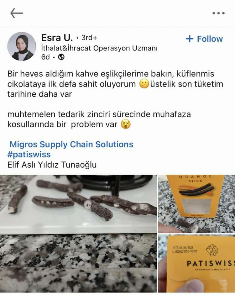 LinkedIn’den küflü çikolata şikayetini paylaşan Elif U. isimli sosyal medya kullanıcısı, muhafaza koşullarında sorun olabileceğini belirttiği bir paylaşım yaptı.
