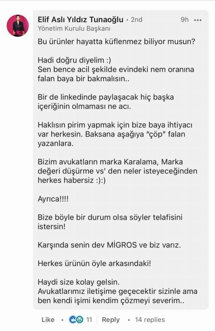 Patiswiss CEO'su Elif Aslı Yıldız Tunaoğlu, LinkedIn üzerinden küflü çikolata paylaşımı yapan bir müşteriyi tehdit etti. Tunaoğlu, tüketiciye dava açmakla tehdit ederek, "Karşında dev Migros ve biz varız" derken, olay sosyal medyada büyük tepki çekti.