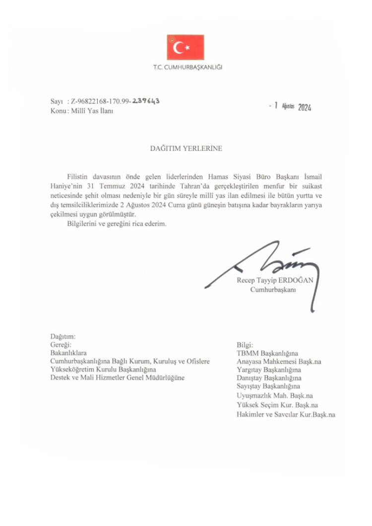 Cumhurbaşkanı Recep Tayyip Erdoğan, "Filistin davasına olan desteğimizi ve Filistinli kardeşlerimizle dayanışmamızı göstermek amacıyla, Hamas Siyasi Büro Başkanı İsmail Haniye’nin şehadeti sebebiyle, yarın 1 günlük milli yas ilan edilmiştir" dedi.