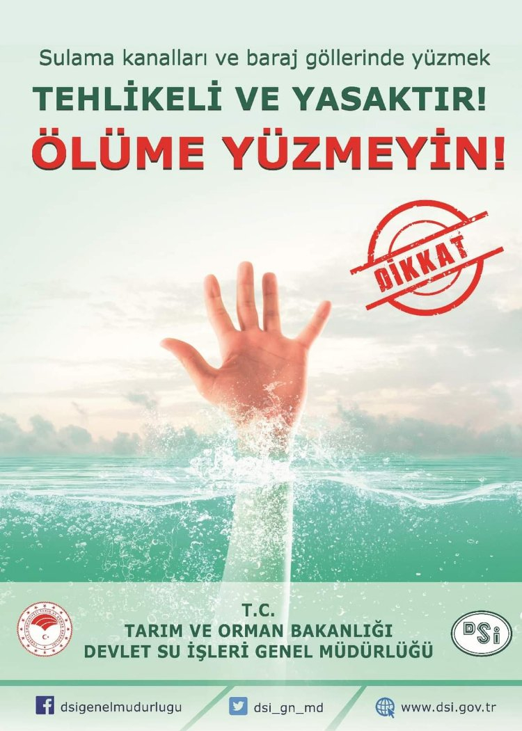 "Havaların ısınmasıyla birlikte baraj, gölet, sel kapanı, regülatör, sulama kanalı gibi su depolama ve iletim tesislerine serinlemek ve yüzmek için giren vatandaşlarımızın sayısında artış gözlemlenmektedir. Su depolama ve iletim tesisleri yüzmek ve serinlemek için son derece uygunsuz tesisler olup bu tesislere girilmesi ölümcül neticeler doğurmaktadır.