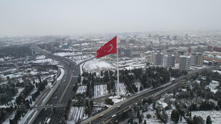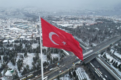 İstanbul'da etkili olan kar yağışının ardından kent beyaza büründü. Beyaz örtüyle kaplanan noktalardan biri de Edirnekapı Şehitliği oldu. Şehitlikteki dev Türk Bayrağı da kar yağışı altında dalgalandı. 115 metrelik rekor yüksekliğe sahip, bin 453 metrekare olan dev Türk bayrağının beyaza bürünen kenti arkasına alarak dalgalandığı anlar havadan görüntülendi. İstanbul'un en büyük 2 bayrağından biri olan Türk bayrağının dalgalanması ortaya güzel görüntüler çıkardı.