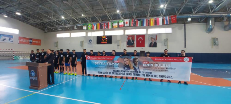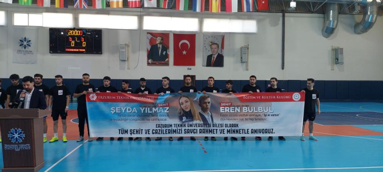 Erzurum Teknik Üniversitesi (ETÜ) Kapalı Spor Salonu'nda 12 takımın katıldığı futsal turnuvasının finali yapıldı. Saygı Duruşu ve İstiklal Marşı'nın okunmasıyla başlayan, şehitler Eren Bülbül ve Şeyda Yılmaz adına düzenlenen futsal turnuvasının finalinden duygu dolu anlar yaşandı. Şampiyonluk maçı öncesinde Şehit Eren Bülbül ve Şeyda Yılmaz'ın annelerine telefonla bağlanıp turnuva için yetkililere teşekkür etti, sporculara başarı diledi. ETÜ Kapalı Spor Salonunda düzenlenen turnuvanın final müsabakasına ETÜ Rektörü Prof. Dr. Bülent Çakmak, Vali Yardımcısı İlyas Öztürk, Türkiye Harp Malulü Gaziler Şehit Dul ve Yetimleri Erzurum Şube Başkanı Recep Akgül, Türkiye Gaziler ve Şehit Aileleri Vakfı Erzurum Şube Başkanı Rıza Demir, Dünya Gençlik ve Spor Konfederasyonu Erzurum İl Başkanı Gürkan Sönmez ve çok sayıda öğrenci katıldı.