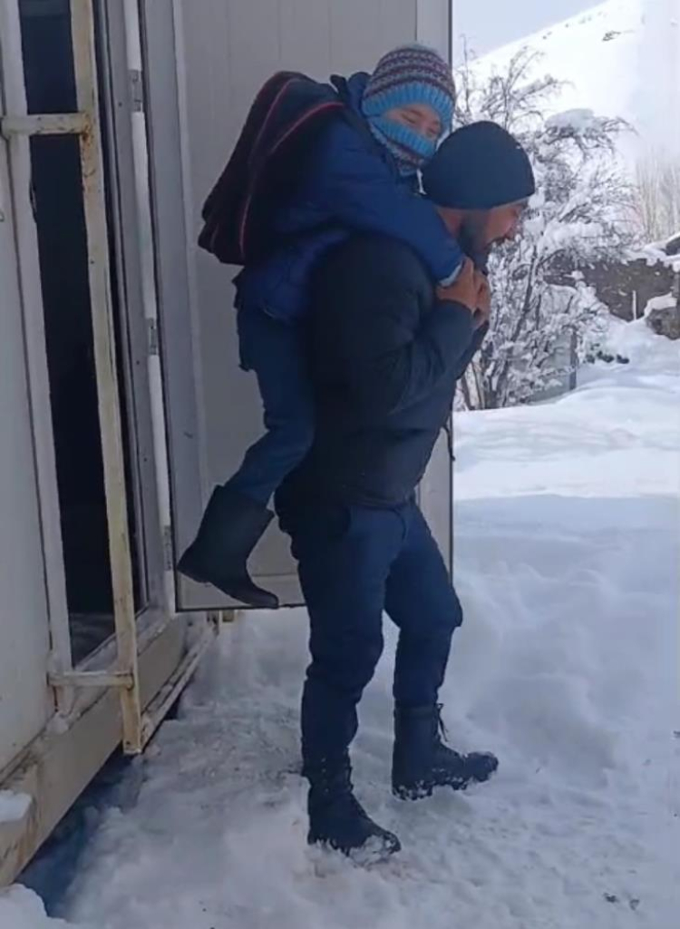 Van'ın Gevaş ilçesinde Cihan Yakut isimli öğretmen, karda yürüyemeyen öğrencisini evine kadar sırtında taşıdı.