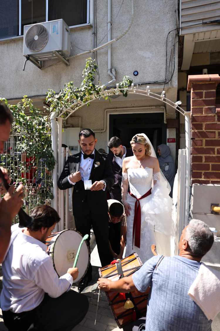 Gelini babasının evinden almak için İstanbul’un Avcılar ilçesine uzun bir araç konvoyu ile gelen damat tarafı, davul ve zurna eşliğinde oynadı. Nilüfer Sazlı, dualarla anne ve babasının evinden uğurlandı. Davulun üzerine çıkan damat Hamit Filizoğlu, yakınlarıyla çiftetelli oynadı.