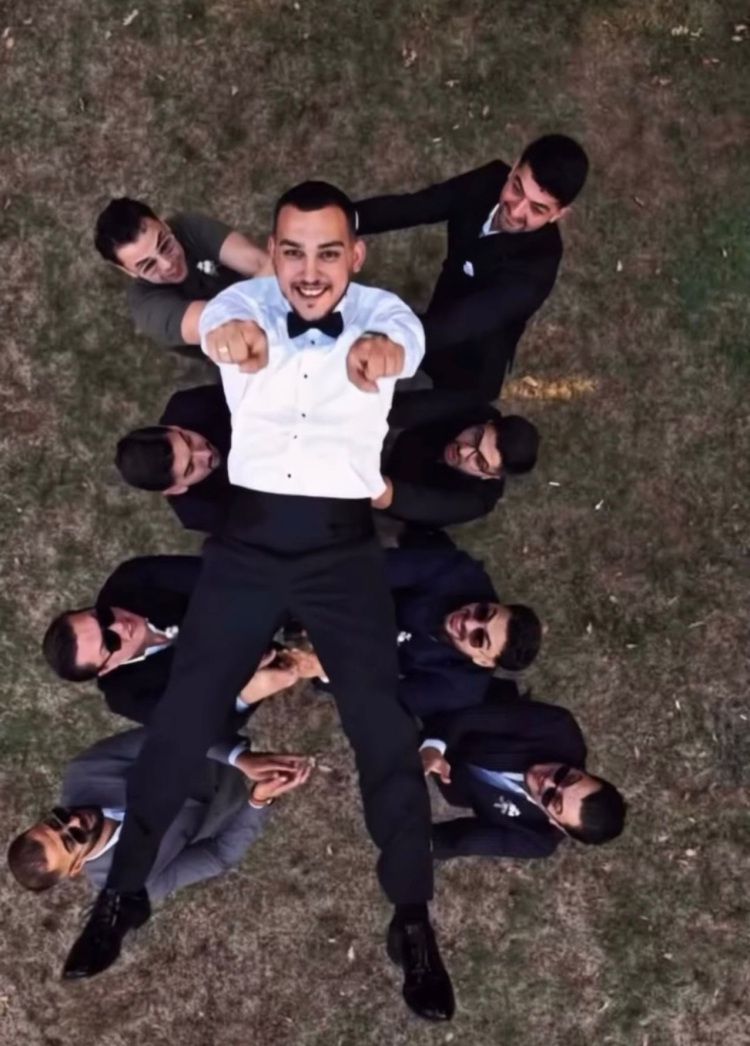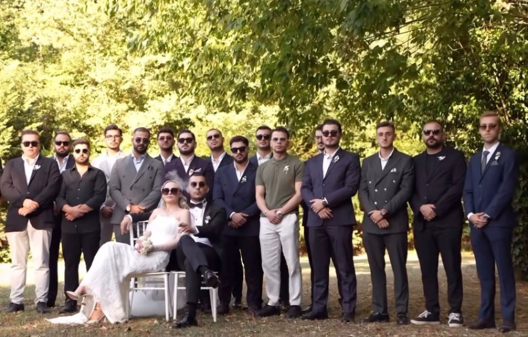 Damat Hamit Filizoğlu’na arkadaşları sürpriz yaptı, havaya fırlatılan Hamit’in soğuk kanlılığı dikkat çekerken, siyah gözlüklerini takan gençler, gelin ve damatla birlikte objektiflere poz verdi.