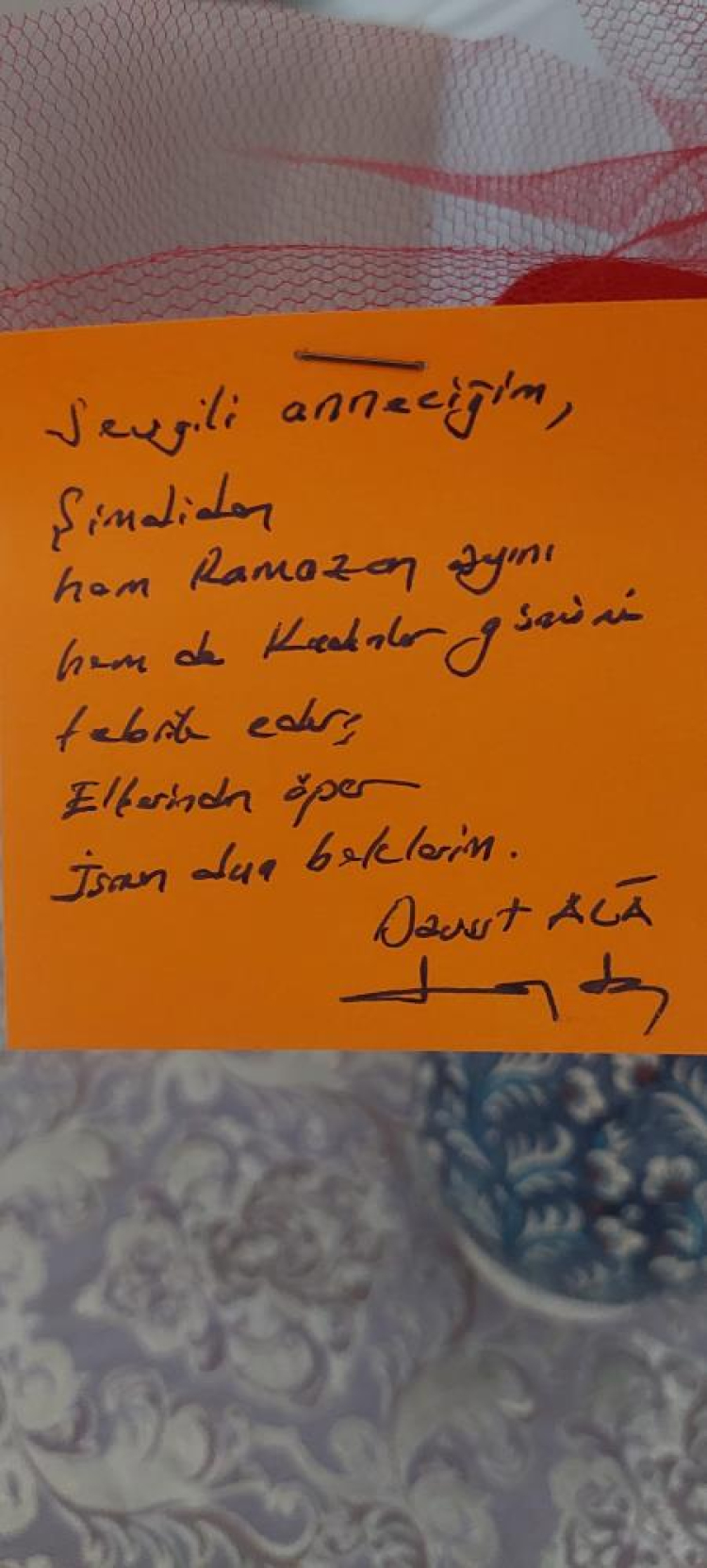 Nota, "Sevgili anneciğim, şimdiden hem Ramazan ayını hem de Kadınlar Günü’nü tebrik eder, ellerinden öper, ismen dua beklerim. Davut Ala" yazan Paşa, acılı aileyi hem mutlu etti hem de duygulandırdı.